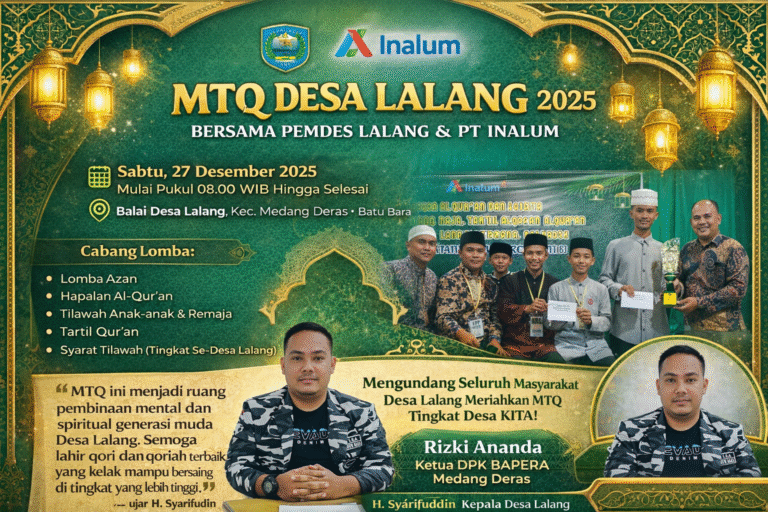 Pemerintah Desa Lalang berkolaborasi dengan PT Inalum sukses menggelar Musabaqah Tilawatil Qur’an (MTQ) tingkat desa, yang berlangsung. Sabtu, 27 Desember 2025 yang digelar di halaman Sekolah Dasar Dusun Tasak, Mulai pukul 08.00 WIB hingga selesai